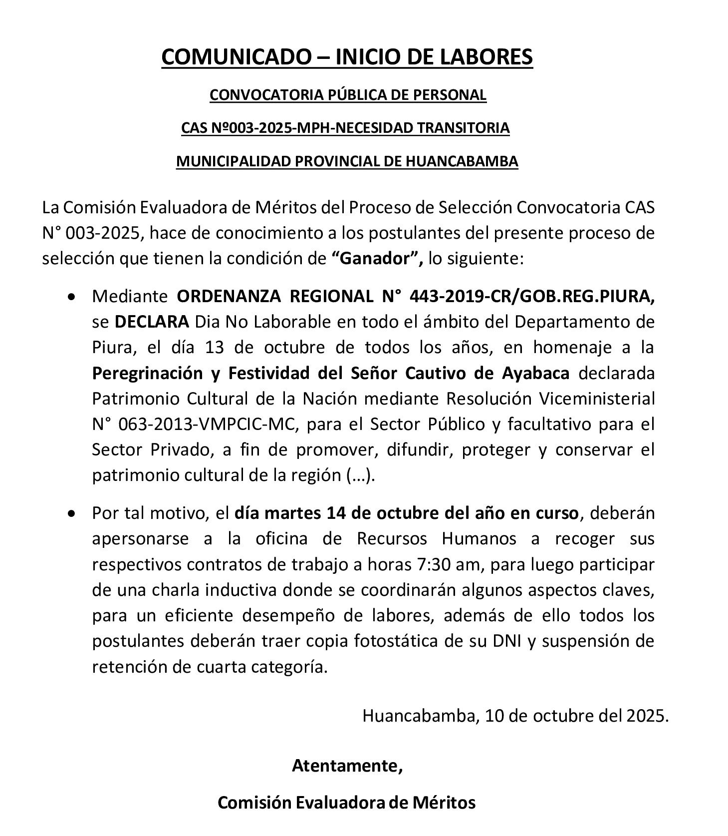 VACANTES DE LA MUNICIPALIDAD PROVINCIAL DE HUANCABAMBA AÑO FISCAL 2025