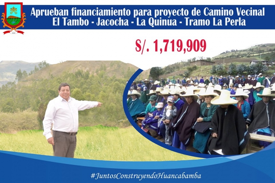 La Municipalidad Provincial de Huancabamba, en su objetivo de tener un Huancabamba próspero, continúa firmemente con el trabajo para generar más proyectos a beneficio de nuestra población huancabambina, es así que el señor Alcalde Lic. Ismael Huayama Neira, gracias a las gestiones constantes que viene realizando, logró que el Ministerio de Economía y Finanzas apruebe la transferencia financiera de S/ 1, 719,909, para ejecutar en los próximos días , obra denominada “REHABILITACIÓN DEL CAMINO VECINAL EL TAMBO - JACOCHA - LA QUINUA, TRAMO LA PERLA -JACOCHA DEL DISTRITO DE HUANCABAMBA - PROVINCIA DE HUANCABAMBA -REGIÓN PIURA”.
