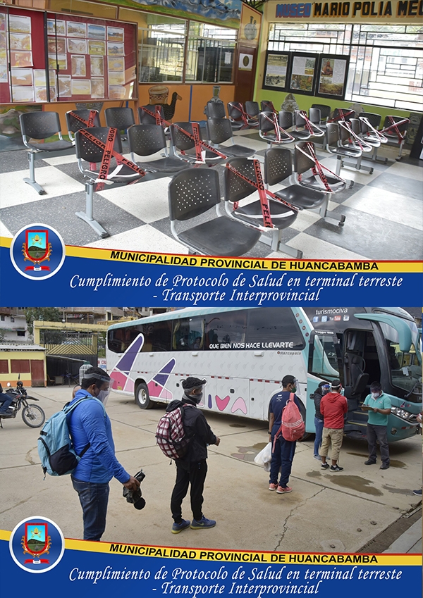 En tanto, la Municipalidad Provincial de Huancabamba, a través de la Administración del terminal Terrestre a cargo del Lic. Pedro Frías, viene dando estricto cumplimiento a las disposiciones, por lo que, se ha realizado la adecuación de la sala de espera, se ha instalado un tanque de agua en el ingreso al Terminal Terrestre, se efectúa los trabajos de limpieza y desinfección de manera permanente, asimismo se brinda el servicio de vigilancia a través de la División de Seguridad Ciudanana, entre otros.