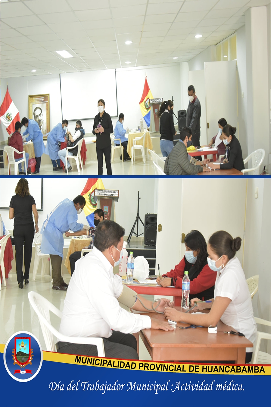 La Municipalidad Provincial de Huancabamba, en el marco del Día del Trabajador Municipal, viene realizando una actividad médica que consiste en la realización de un hemograma completo y entrega de kit de medicina dirigido a los funcionarios, trabajadores y servidores municipales, promovido a través de la Oficina de Recursos Humanos, en el lineamiento de vigilancia y protección de la salud de los trabajadores ediles, con base en la Ley 29783, Ley de Seguridad y Salud en el Trabajo.