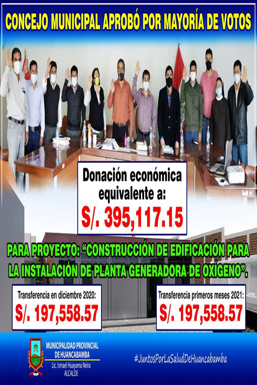 https://static.xx.fbcdn.net/images/emoji.php/v9/t33/1/16/2705.png");">✅En este sentido, el Concejo Municipal de la provincia de Huancabamba, con el fin de seguir salvaguardando la vida y salud de la población huancabambina y siendo conscientes de que la pandemia no ha desaparecido por el registro de paisanos que requieren actualmente de oxígeno en el centro covid de la localidad, en Sesión Extraordinaria N° 20-2020, aprobó una donación económica de S/ 395.117.15 que será transferida a la Asociación sin fines de lucro “Cruzada por la vida – Ayúdanos a ayudar”, para la ejecución del importante Proyecto “Construcción de edificación para la instalación de planta generadora de oxígenos de uso medicinal de la provincia de Huancabamba”, de los cuales, S/ 197,558.57 serán transferidos en el presente mes y el saldo restante a inicios de 2021, para la finalización de los trabajos.